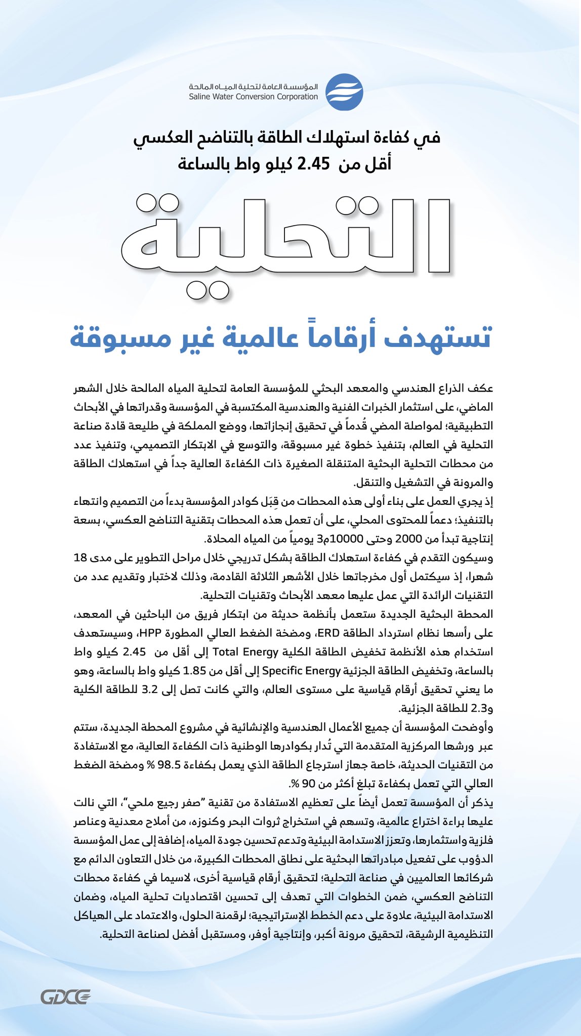 المؤسسة العامة لتحلية المياه تعلن بدء القبول في 160 وظيفة إدارية