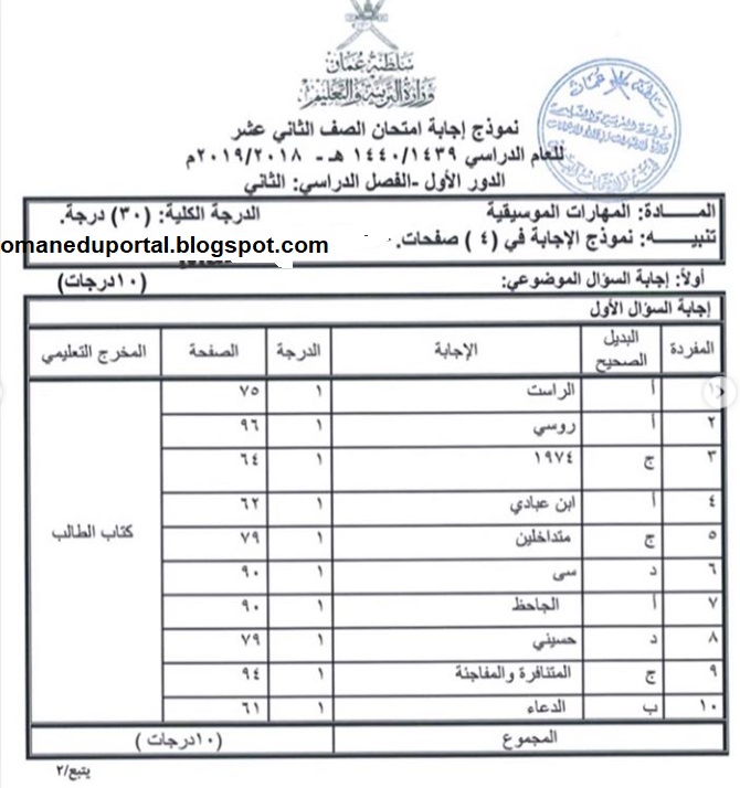 نموذج اجابة امتحان المهارات الموسيقية للصف الثاني عشر الفصل الثاني الدور الاول 2018 2019
